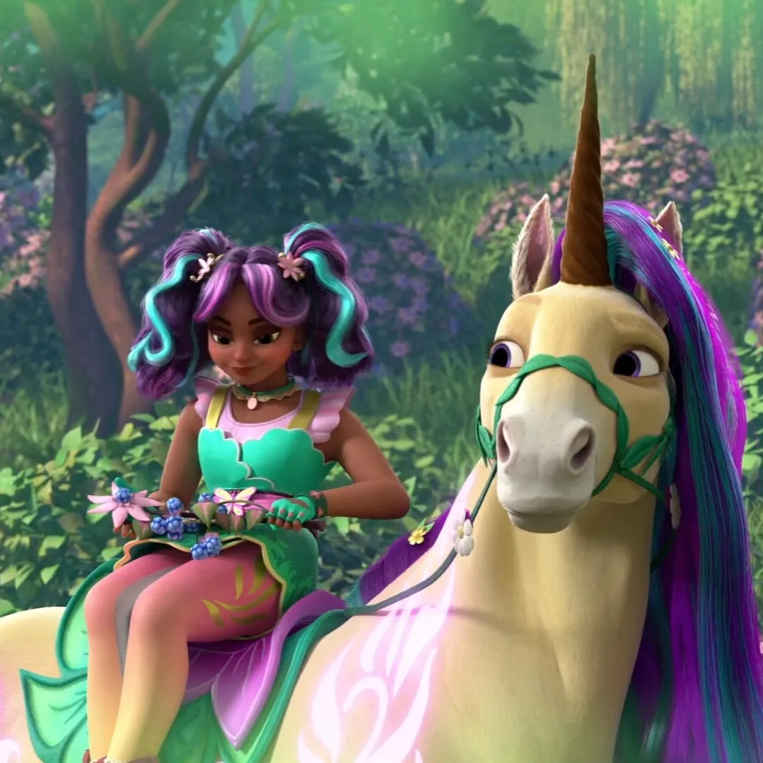 Nel cuore della foresta incantata dell’Isola degli Unicorni, Ava ride sulla schiena di Star. «Secondo te la mia ghirlanda piacerà a Sophia?» chiede intrecciando fiori. Star risponde: «Solo se non la impigli di nuovo nella mia criniera!» Ava ride: «Non prometto nulla!» Tra petali svolazzanti esclama: «Portiamola al festival di primavera, prima che il vento la porti via!»