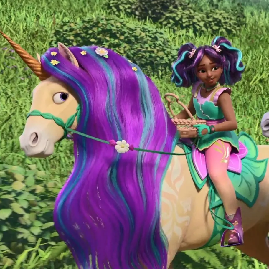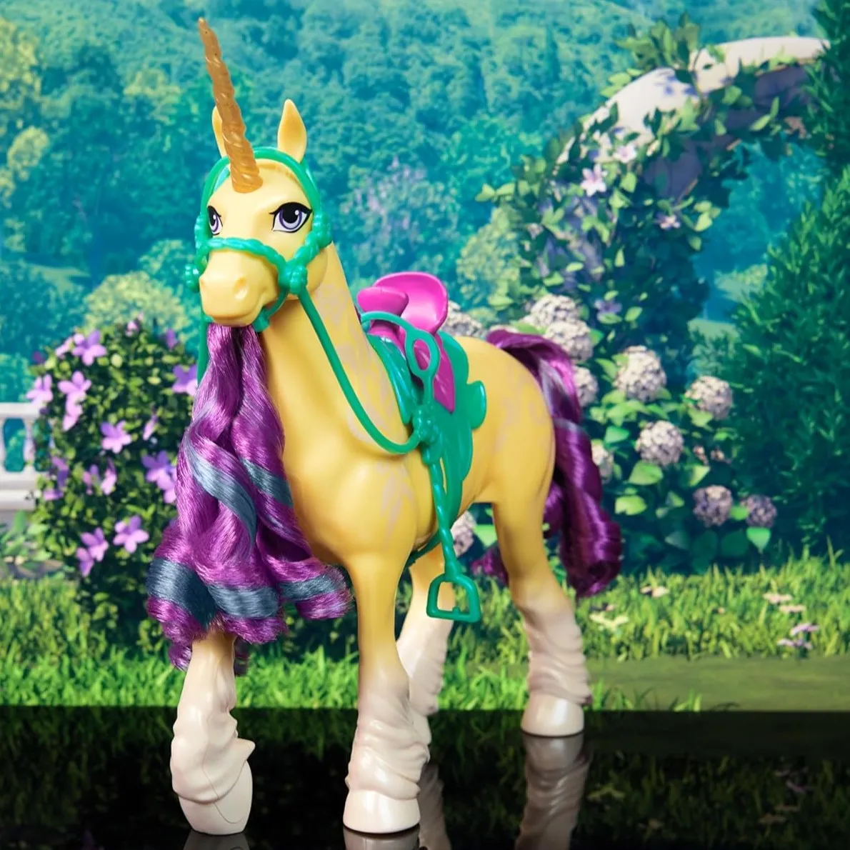 L'unicorno Biglietto dell'Accademia degli Unicorni ha una corna scintillante, segni perlacei di magia vegetale e una criniera e coda pettinabili. I bambini possono muovere la testa e scoprire la sua personalità, cambiare sella e briglia e inventare storie ispirate alla serie di Netflix. La dimensione è ideale per piccole mani e grandi sogni.